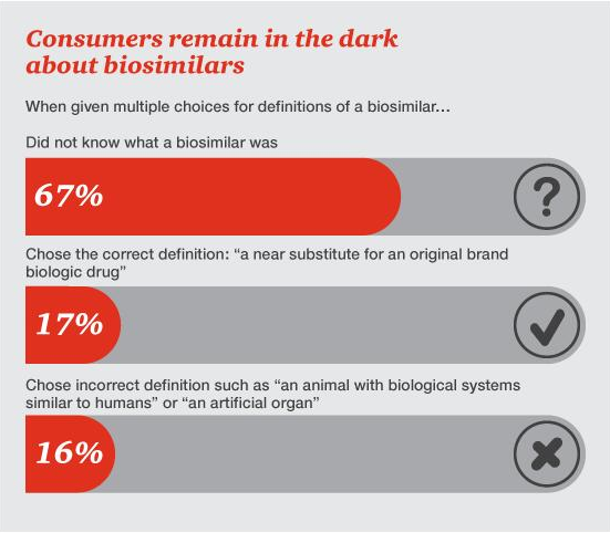 目前,大多数消费者尚不太清楚什么是生物仿制药。根据2015年的HRI报告,83%以上的消费者未能正确选出生物仿制药的定义,其中的67%回答不知道,另有16%选择了错误选项。仅有17%的消费者能做出正确的选择。在过去的三十年里,仿制药以较低的价格让消费者克服了陌生和不安感,而随着越来越多的患者在网上发布其用药反馈,相信可以帮助生物仿制药更快地得到消费者的认可。