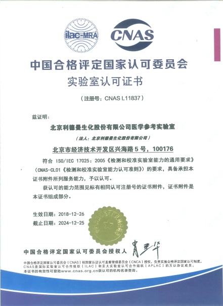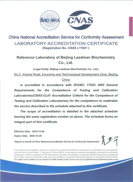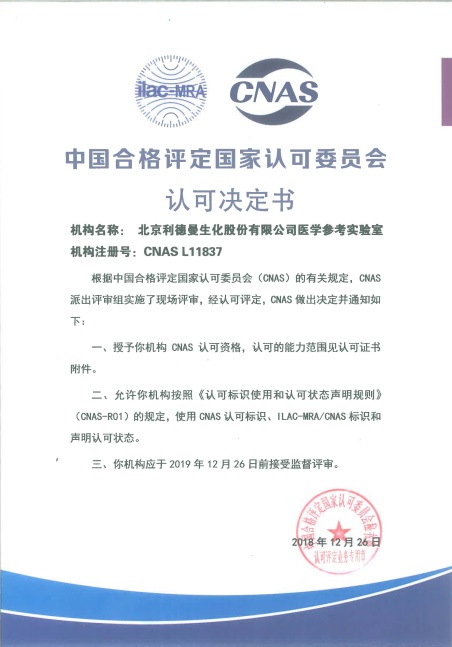 参考实验室于2018年8月向CNAS提交认可申请,9月通过文审,CNAS评审专家组于11月10日-11月11日对登录入口参考实验室进行现场评审。经过审核文件、现场检查、现场实验等方式的审查,CNAS评审专家组一致同意通过现场评审。参考实验室于2018年12月26日获得CNAS参考实验室ISO17025和ISO15195的认可证书,认可范围包括ALT、AST、GGT、ALP、AMY、CK、LDH七个酶学参考测量程序。